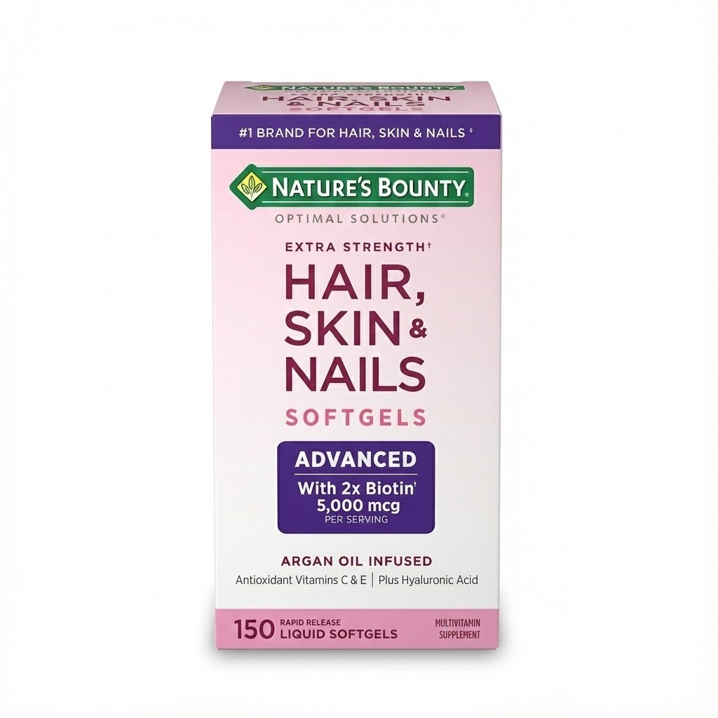 Nature’s Bounty® Hair, Skin & Nails formula, contains just the right balance of nutrients to help support beautiful hair, strong nails and vibrant skin. This innovative formula provides with the vital nutrients our body needs to support our natural beauty from within. B Vitamins help with energy metabolism, and Biotin helps to maintain healthy hair. Vitamin E and Vitamin C are antioxidants. Vitamin E contributes to skin health, and Vitamin C is involved in collagen production and formation, which forms the basis for vibrant skin. Vitamin A assists with skin maintenance, and overall health.